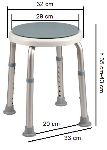 Sedile regolabile in altezza, con seduta girevole realizzata in materiale plastico ad alta densità e struttura in alluminio anodizzato. Puntali in gomma antiscivolo. Grazie alle sue ridotte dimensioni, può essere utilizzato per la doccia e per altre necessità d’igiene personale.