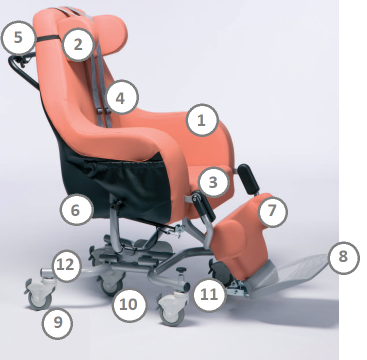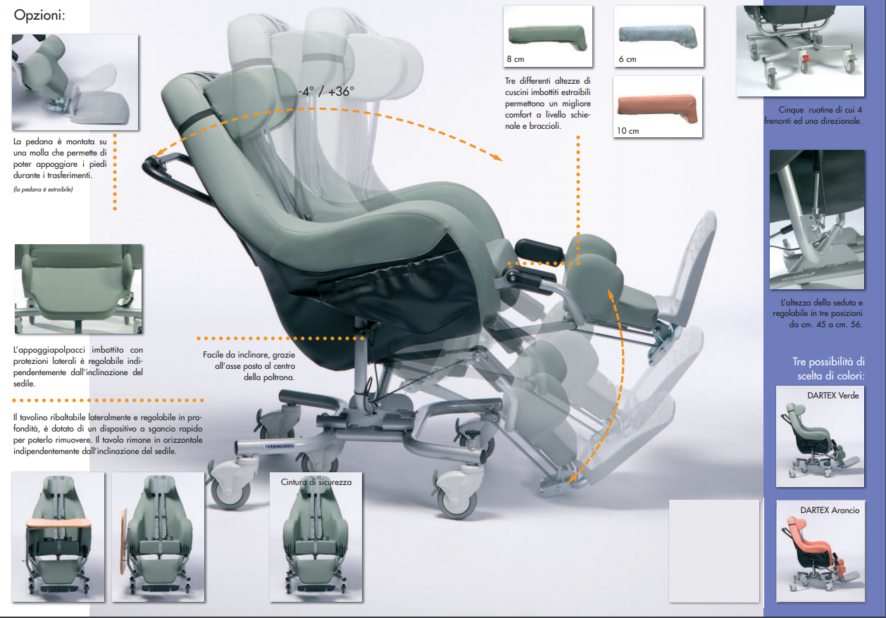 Pratico e confortevole seggiolone polifunzionale, con seduta basculante. Larghezza seduta cm.38-40-42-44-48. Peso della carrozzina: 36 kg; peso massimo utilizzatore: 120 kg.