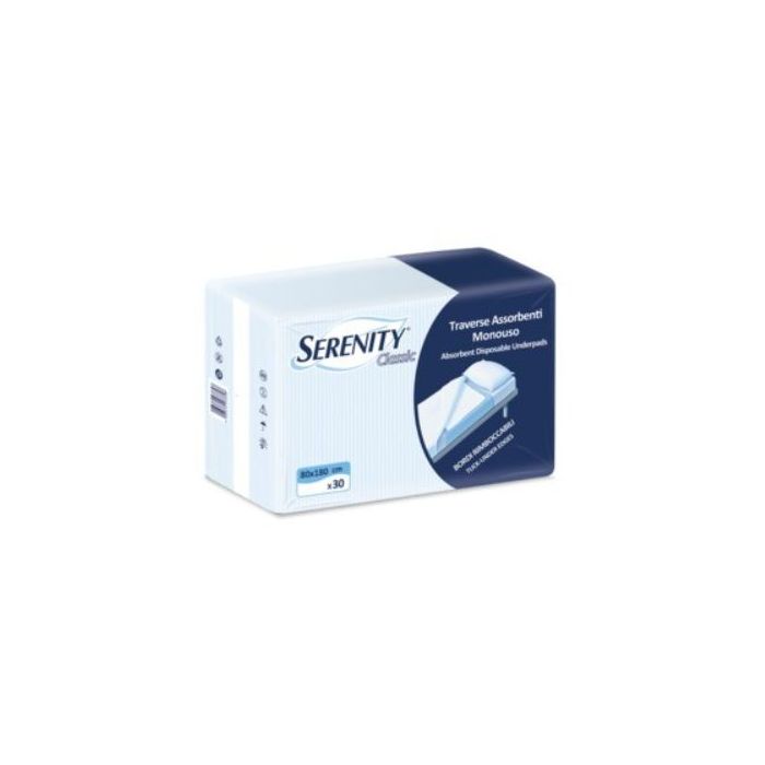 La Traversa Serenity è costituita da uno strato di cellulosa e un uno strato morbido di tessuto non tessuto che garantiscono un riposto confortevole e asciutto. Il rivestimento esterno è in polietilene antiscivolo, essenziale per contenere eventuale fuoriuscita di liquidi.