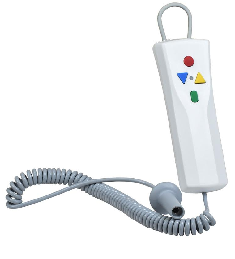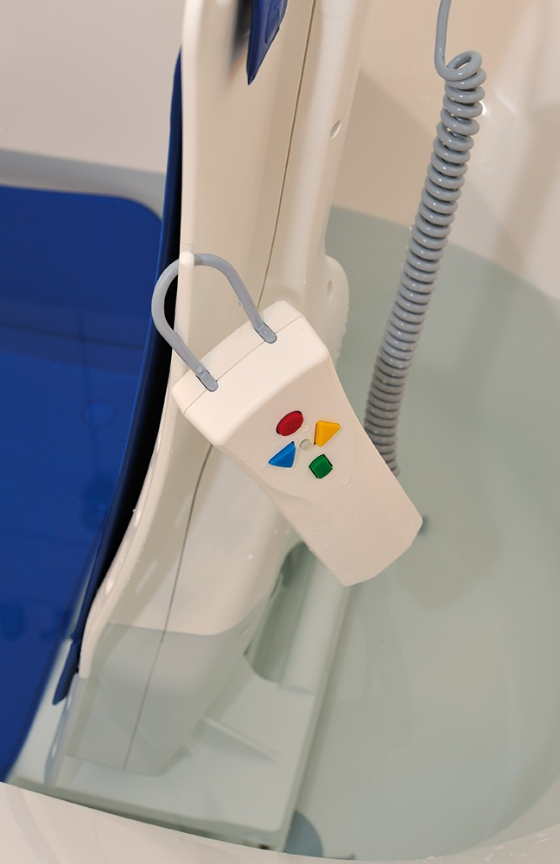 Il sollevatore per vasca da bagno è dotato di un telecomando leggero e galleggiante a batteria con ricarica veloce e batteria integrata. I tasti funzione eseguono le seguenti funzioni: On/Off/Sù/Giù. Il colore diverso dei comandi facilita il riconoscimento da parte di persone con problemi di vista.