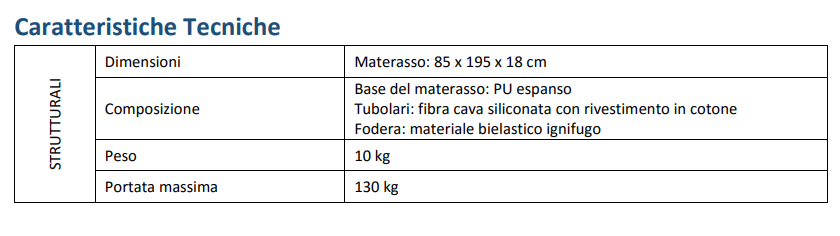 Materasso per la prevenzione del decubito con base in poliuretano espanso ignifugo, realizzato con tubolari in fibra cava siliconata con rivestimento in cotone ignifugato e fodera esterna in materiale bielastico ignifugo classe 1IM, impermeabile, traspirante, antibatterica, antistatica e antimuffa, completa di cerniere su tre lati. L’elevata resilienza del materasso e l’alta traspirabilità consentono un’efficace azione nella prevenzione dell’insorgenza di lesioni da decubito.