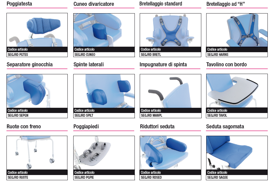 JORDI è una seggiolina utilizzabile in ambito scolastico, domestico e di lavoro consigliata come sedia terapeutica. È un ausilio utile nel processo di riabilitazione, sia in termini di terapia che di integrazione, in grado di accompagnare le attività quotidiane come l’apprendimento ed i pasti. Tra le caratteristiche principali figurano la regolazione in altezza indipendente delle quattro gambe e la stabilità dell’ausilio grazie al particolare design.