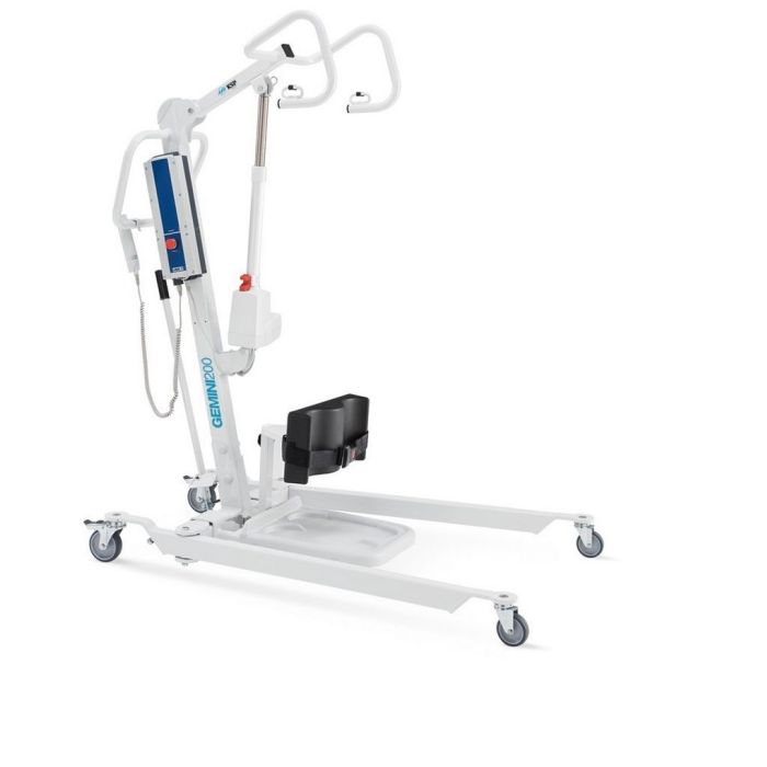 Struttura realizzata in acciaio verniciato con polveri epossidiche in tunnel termico a 200°. Maniglione di spinta con angoli arrotondati. Base a bracci mobili regolabili su tre posizioni a mezzo leva centrale, corredata da 2 ruote posteriori con freno indipendente e 2 ruote anteriori gemellari. Verticalizzazione del paziente tramite attuatore lineare elettrico 24V DC e pulsantiera con cavo. Batteria ricaricabile intercambiabile a mezzo trasformatore di rete. Dotato di dispositivo manuale di emergenza di discesa.