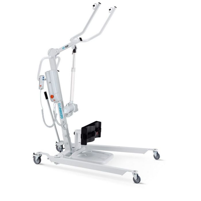 Struttura realizzata in acciaio verniciato con polveri epossidiche in tunnel termico a 200°. Maniglione di spinta con angoli arrotondati. Base a bracci mobili regolabili su tre posizioni a mezzo leva centrale, corredata da 2 ruote posteriori con freno indipendente e 2 ruote anteriori gemellari. Verticalizzazione del paziente tramite attuatore lineare elettrico 24V DC e pulsantiera con cavo. Batteria ricaricabile intercambiabile a mezzo trasformatore di rete. Dotato di dispositivo manuale di emergenza di discesa.